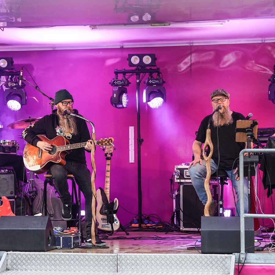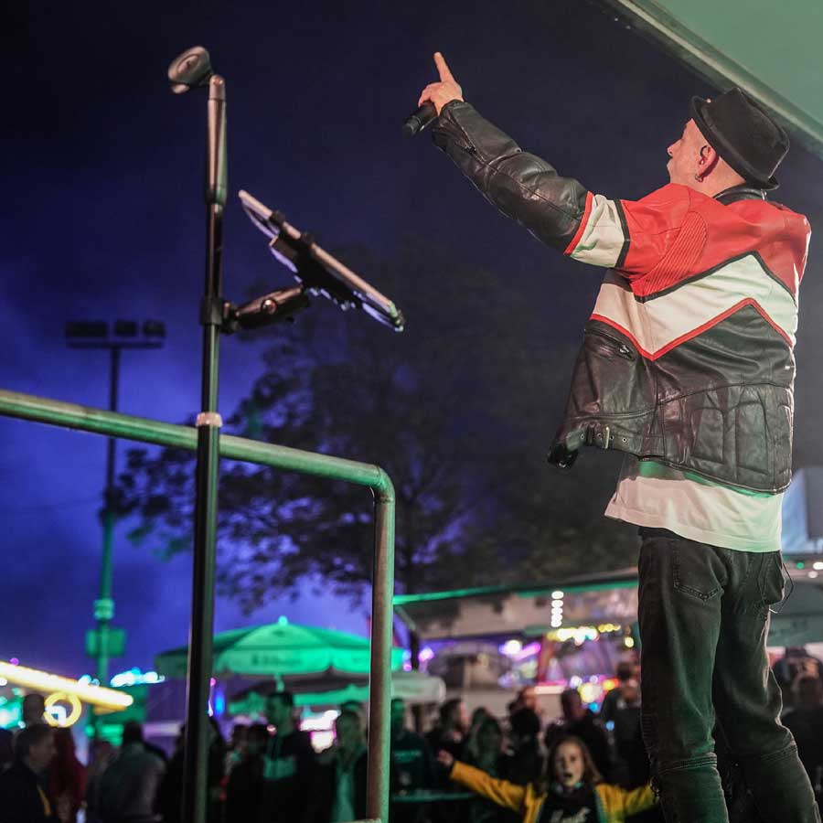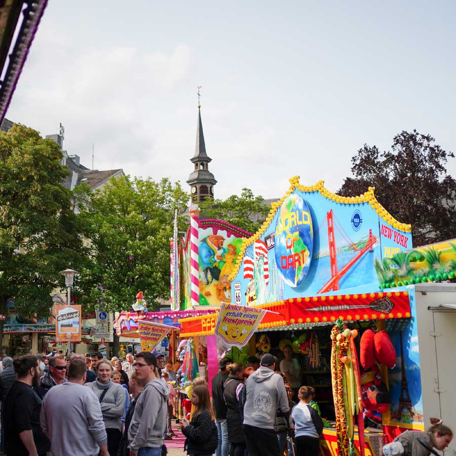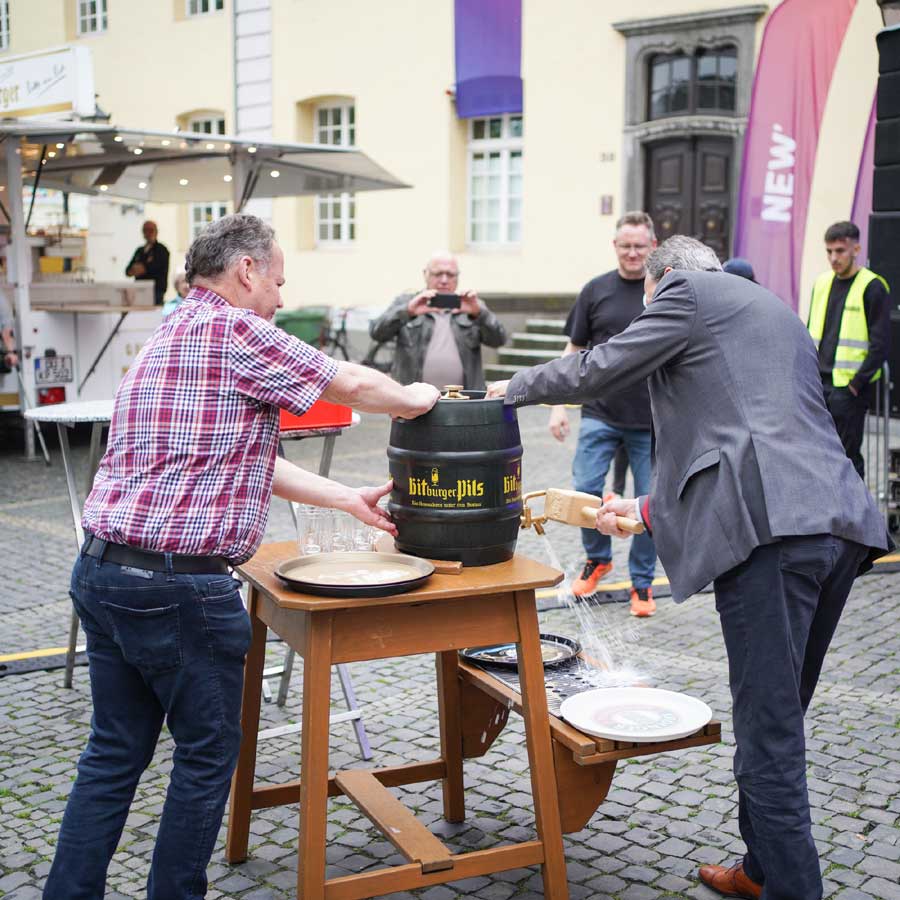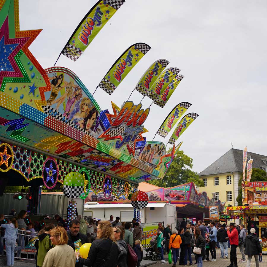 - Live-Musik: Lokale Bands und DJs auf der NEW-Bühne am Kreuzherrenplatz – Pop, Rock, Schlager und Volksmusik.