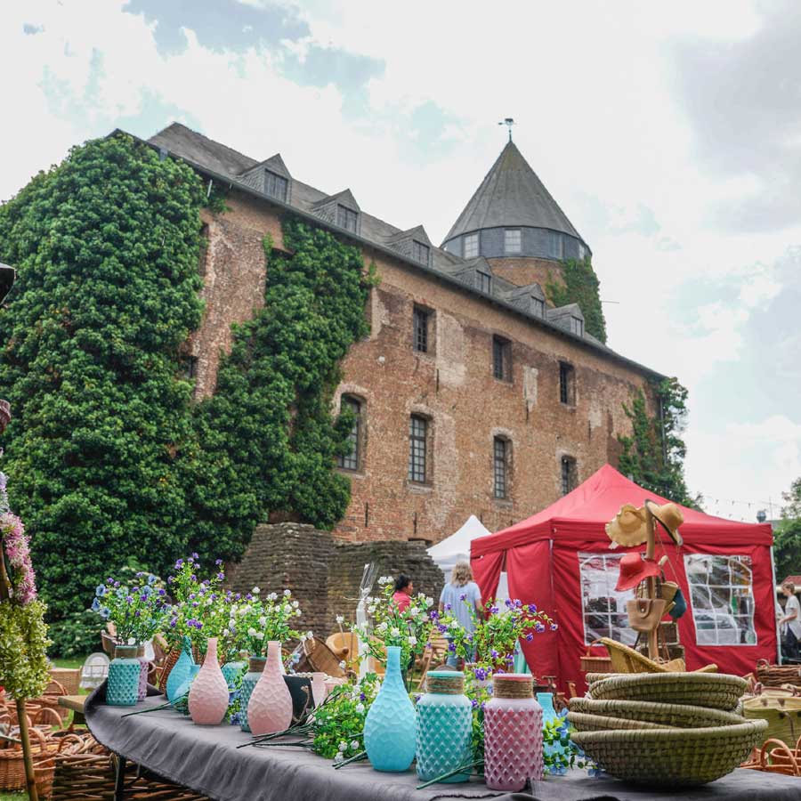 Rund um die Burg Brüggen findet ein Kunsthandwerkermarkt statt.