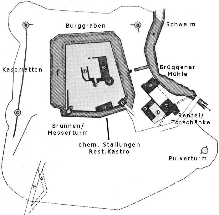 - Die Burg Brüggen besaß einst vier Türme und zudem einen umfassenden Wassergraben, welcher sich hinten um das heutige Restaurant Kastro erstreckte und nunmehr zugeschüttet sowie exakt von einer Straße überdeckt wird.